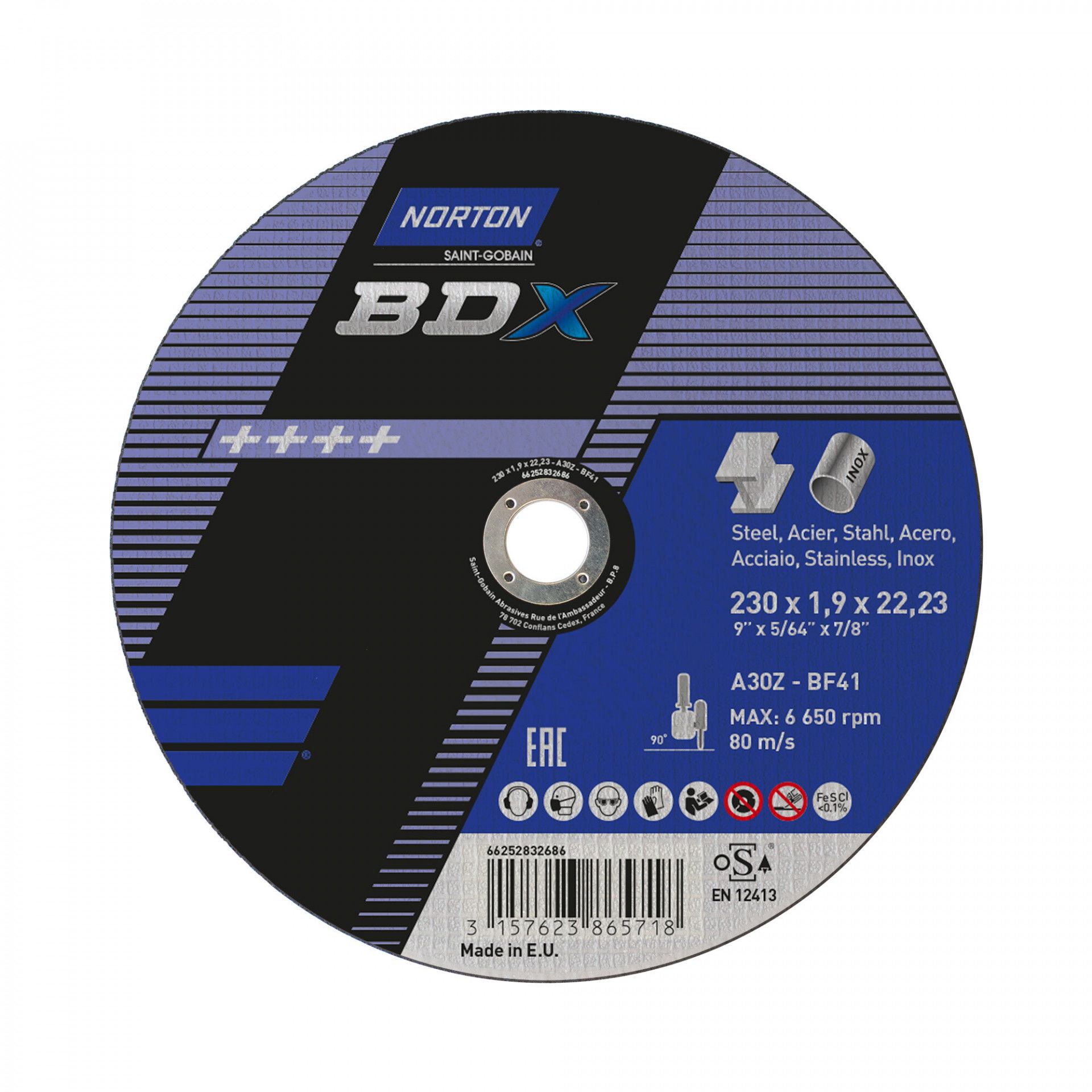 A Norton BDX fém-inox sorozat rendkívül vékony vágókorongokat kínál acél- és rozsdamentes acél széles választékához. A Norton BDX a költséghatékony vágókorongok szabványát állította be, amelyek hosszú élettartamot és gyorsabb fém eltávolítást biztosítanak az éles szilícium-karbid szemcséknek köszönhetően. Max.vágási sebesség : 80 m/s. Vas, kén és klór mentes. Nincs szennyeződés. Kevesebb rezgés.
