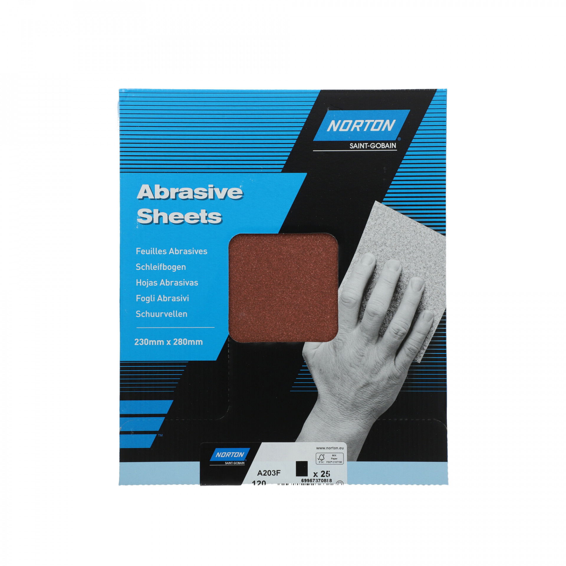 Norton Clipper A203F univerzális csiszolópapír minden fa csiszolásához. Alumínium-oxid szemcséjével és FSC® tanúsítvánnyal ez egy nagyon megfizethető lehetőség. Az FSC® tanúsítvány garantálja a felelős származást és a környezetbarátságot. Az alumínium-oxid szemcsék kiváló eredményt adnak fán, lakkon és vakolaton.