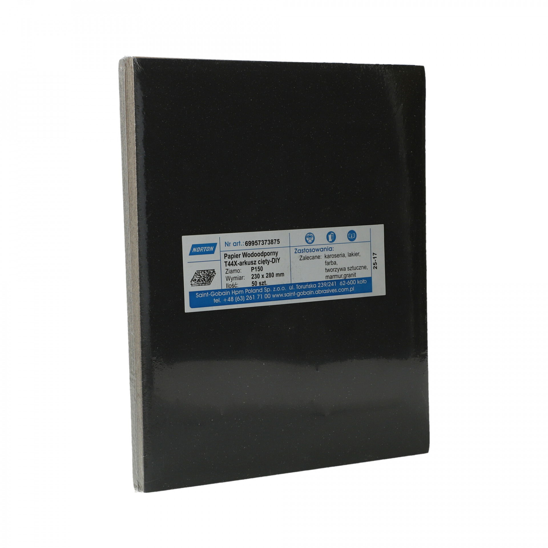 A Norton T44X vízálló csiszolópapír nagy teljesítményű szilíciumkarbid szemcsével nedves vagy száraz használatra alkalmas, nedves használat esetén tisztább felületet biztosít csiszolás közben. Gyors anyageltávolítás és simább és fényesebb felület elérése, ideális lakkozott felületeken való használatra és fémekhez. Festék- és lakkburkolatok, műanyagok, vas- és színesfémek csiszolására, polírozására is szolgál. Használható önmagában, csiszolótömbbel, kapcsos rögzítésű elektromos vagy akkumulátoros csiszológéppel.