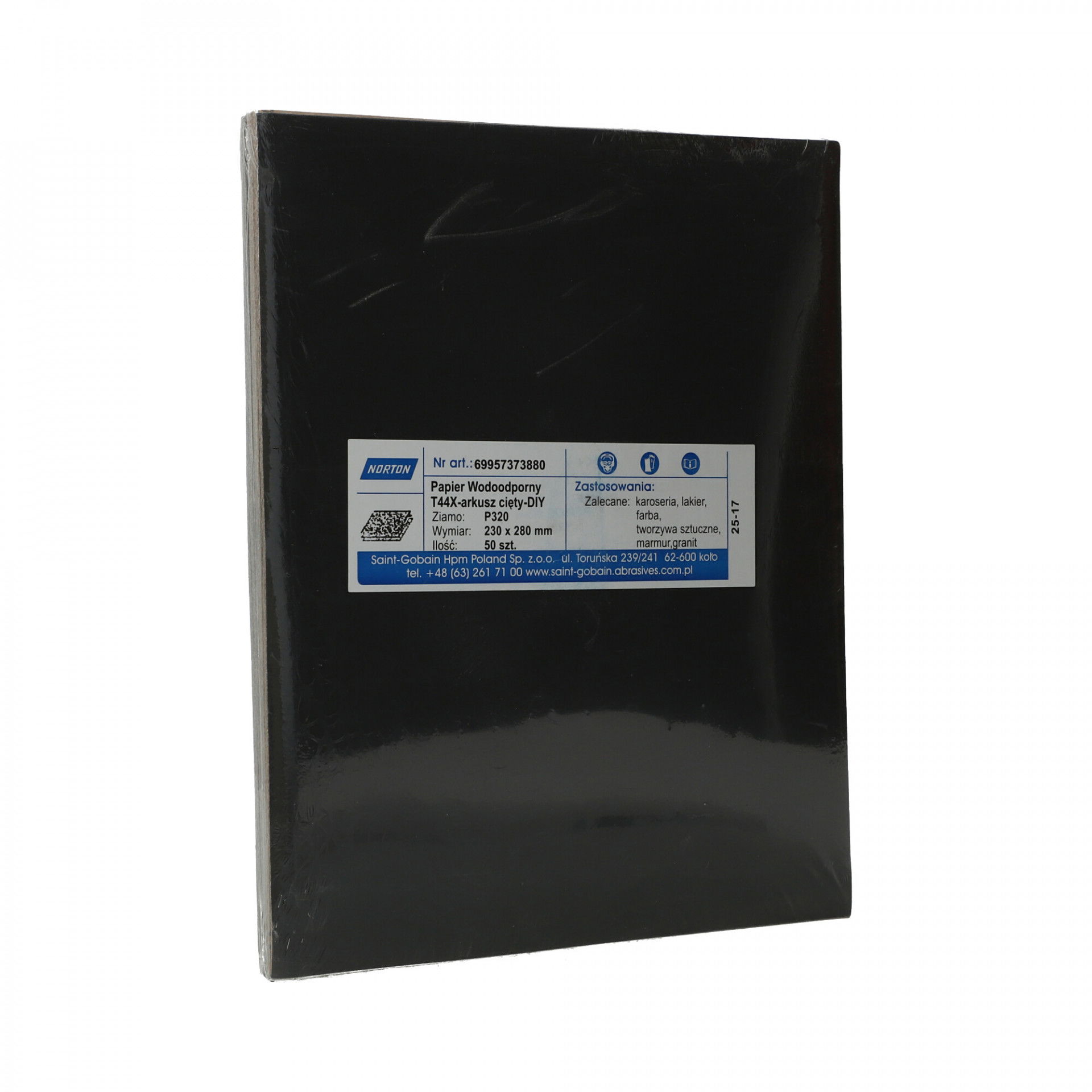 A Norton T44X vízálló csiszolópapír nagy teljesítményű szilíciumkarbid szemcsével nedves vagy száraz használatra alkalmas, nedves használat esetén tisztább felületet biztosít csiszolás közben. Gyors anyageltávolítás és simább és fényesebb felület elérése, ideális lakkozott felületeken való használatra és fémekhez. Festék- és lakkburkolatok, műanyagok, vas- és színesfémek csiszolására, polírozására is szolgál. Használható önmagában, csiszolótömbbel, kapcsos rögzítésű elektromos vagy akkumulátoros csiszológéppel.